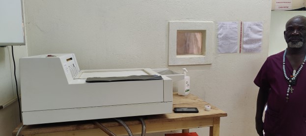 We had freighted out an Automatic X-ray film processor in advance but due to problems in customs it didn’t arrive at the hospital until Tues of our second week. This piece of equipment standardises image processing, cuts down on the film handling so less scratches or finger marks, much quicker than wet developing (film comes out dry) and reduces the staff exposure to the toxic chemicals. (Wet developing has open containers of chemicals to dip the film into)